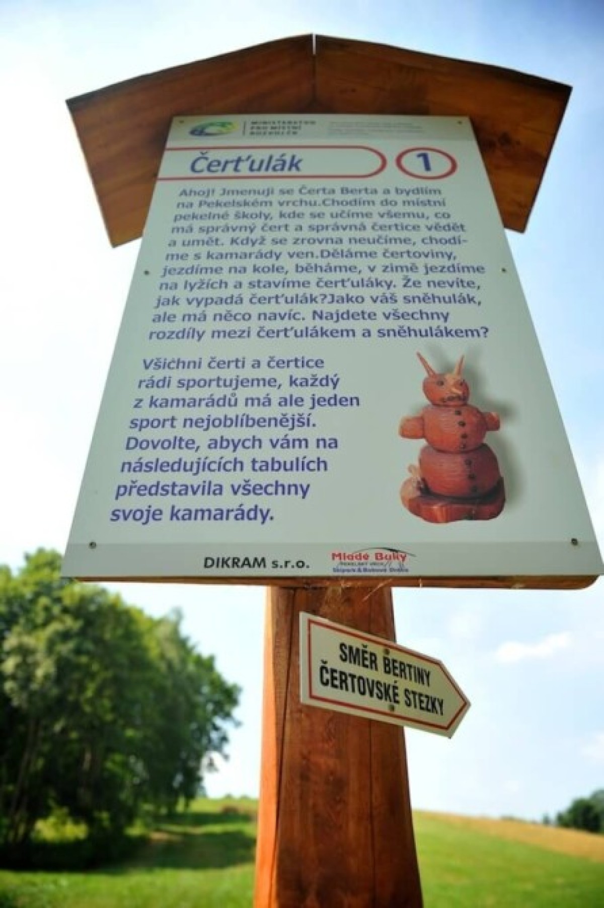 Přemýšlíte nad tím, kam vyrazit s dětmi v Krkonoších? Pak vám nesmí uniknout naučná čertovská stezka, kterouzvládnou i ti nejmenší. Na půlkilometrové trase se dozvíte, kde žije stará čerta Berta, co se učí v čertovské škole ičím se baví čertovské děti.Po cestě potkáte několik informačních cedulí, kde se dozvíte všechnypodrobnosti o životě pekelníků. Kromě čtení tabulí si s čerty mohou děti izasportovat a zasoutěžit.Tak neváhejte a vyrazte na výlet, vybrali jsme pro vás dalšínaučné stezky pro dětiv krkonošské přírodě.celý popis aktivityskrýt popis
