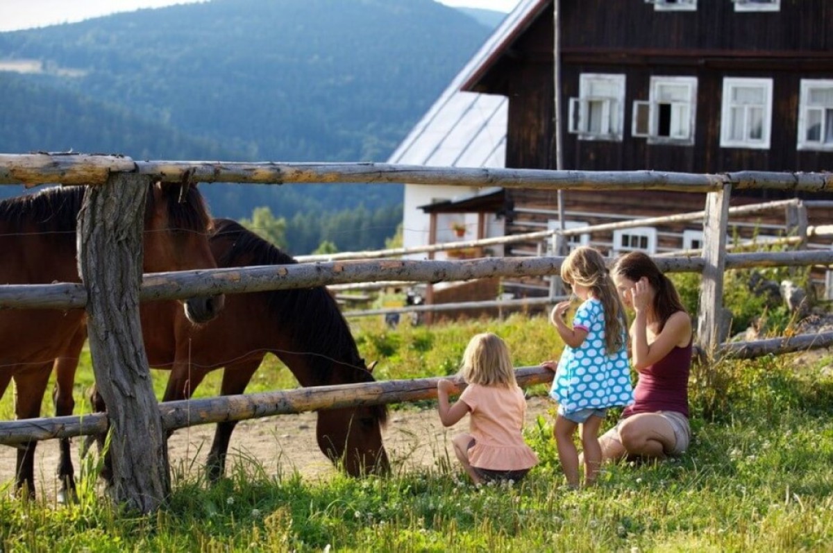Udělejte si výlet na koňskou farmu. Na pastvinách se zde pasestádo huculských koní, které se počtem i kvalitou řadí mezi nejlepší chovy v České republice. Když budete mít chuť, můžete si i zajezdit – projížďky objednávejte na čísle +420 604 245 225.Okružní výlet Benecko – Ekofarma Hucul – BeneckoK farmě se můžete vydat pěšky, máme tip napříjemný okruh v délce 10 km. Z centrálního parkoviště na Benecku (800 m n. m.) se vydejte po zelené značce, dojdete k Bellevue (840 m n. m.) a přes tzv. Tobogán se dostanete na křižovatku turistických cest Na Rovince (846 m n. m.). V případě, že máte kočárek, zvolte směr Rovinka raději asfaltovou cestu. Občerstvení Rovinka je vyhledávaným místem v každém ročním období. Od pohodového občerstvení se vydejte dále cca 250 metrů po žluté značce a potom po vrstevnici na rozcestí. Po kamenité cestě sejdete na Ekofarmu Hucul (812 m n. m.).Po pobytu na farmě se vrátíte na cestu, po které jste přišli, ujdete pár metrů na rozcestí (před chatou Tereza) a odbočíte vpravo dolů směrem k chatě Jasná a na dalším rozcestí se dejte vlevo k chatě Zákoutí. Následujte žluté turistické značení, které nás přivede zpět na Rovinka, odtud se dostanete po asfaltové cestě opět na Benecko.Objevujte s dětmi KrkonošePomohou vám našetipy na ubytováníirodinné výlety.celý popis aktivityskrýt popis