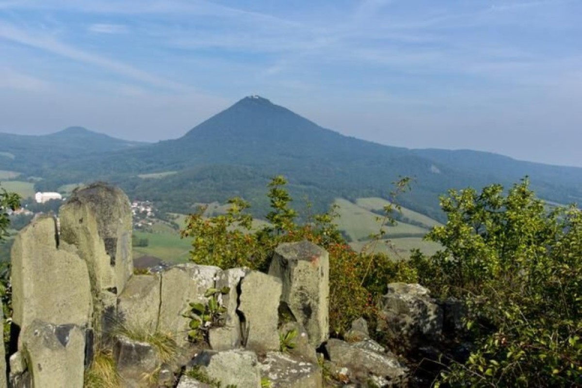 Milešovka,nejvyšší vrcholČeského středohoří (837 m), známá také jako Hromová hora. Meteorologická stanice na jejím vrcholu funguje více než100 let, rozhledna ještě déle. Tu současnou můžetenavštívit celoročně, ale pouze za příznivých klimatických podmínek.