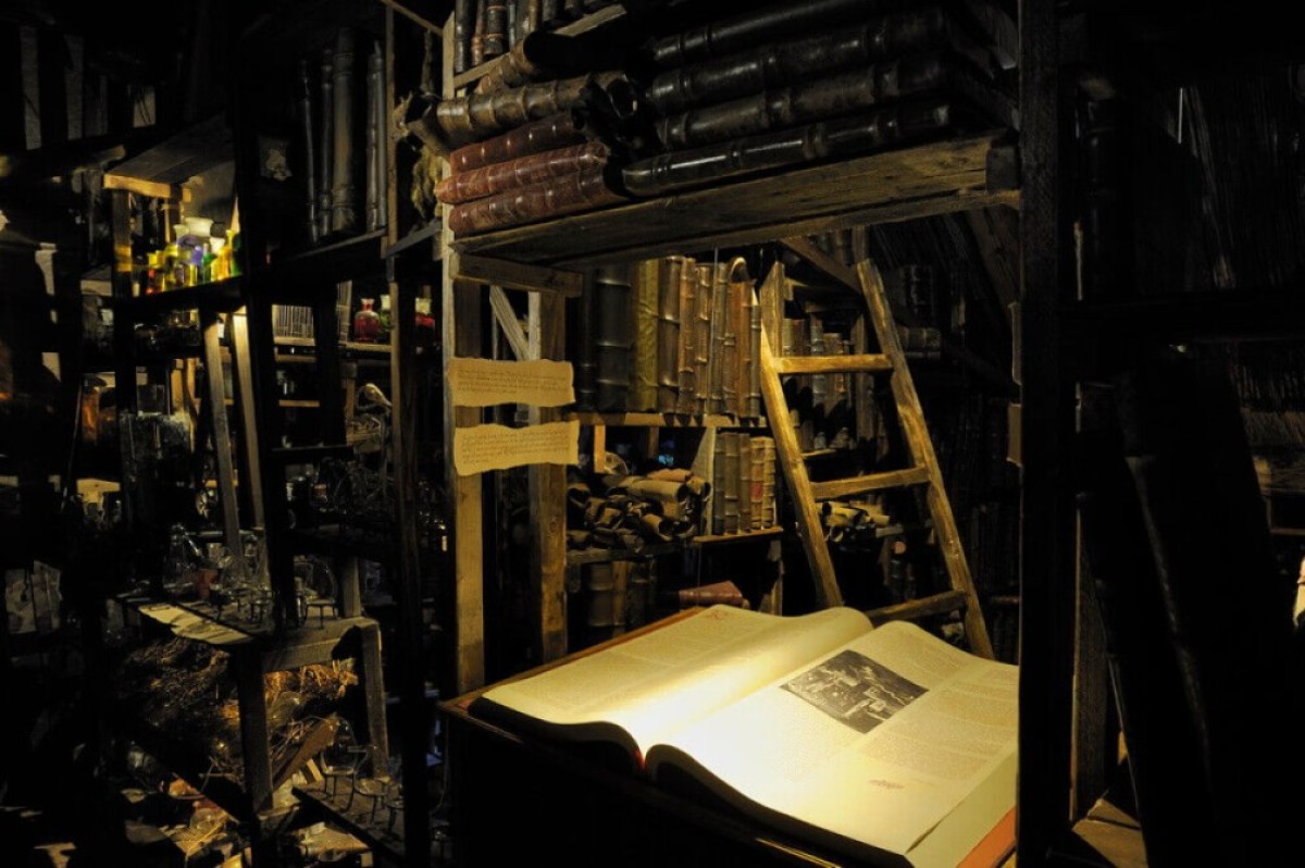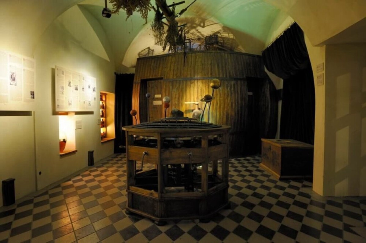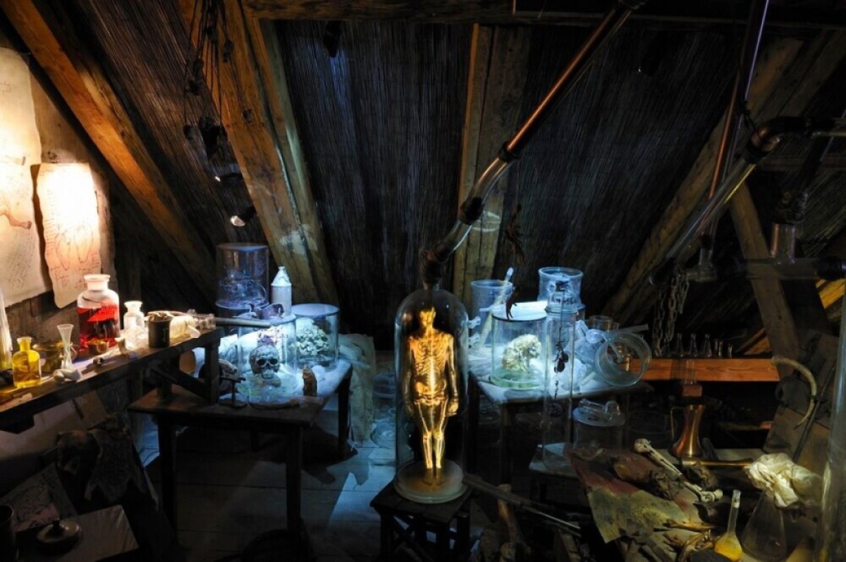 V přízemí domu se návštěvníci dozvízákladní údaje o alchymii a hlavních osobnostechtéto dovednosti, a to nejen z druhé poloviny 16. století, ale i z dalších historických epoch napříč staletími až do dnešních dnů. Nechybí ani interaktivní exponáty: Zájemci si mohou sestavit vesmír podle vlastního přání, ozkoušet, zda nemají na rukou zlato, vyrobit kámen mudrců a nebo se stát součástí výroby fosforu v obřím sudu.Ojedinělý zážitek nabízí téžtajemná místnostz faustova domu, kde tři alchymisté přihlížejí odnosu Fausta do pekla dírou ve stropě.Po prohlédnutí přízemí čeká návštěvníky zážitek v podobědřevěného schodiště, které jejedno z nejstarších v Prazea možná jej navrhoval sám Edward Kelley. Jeho tvar totiž nápadně připomíná jeden ze základních alchymistických symbolů -spirálu života.