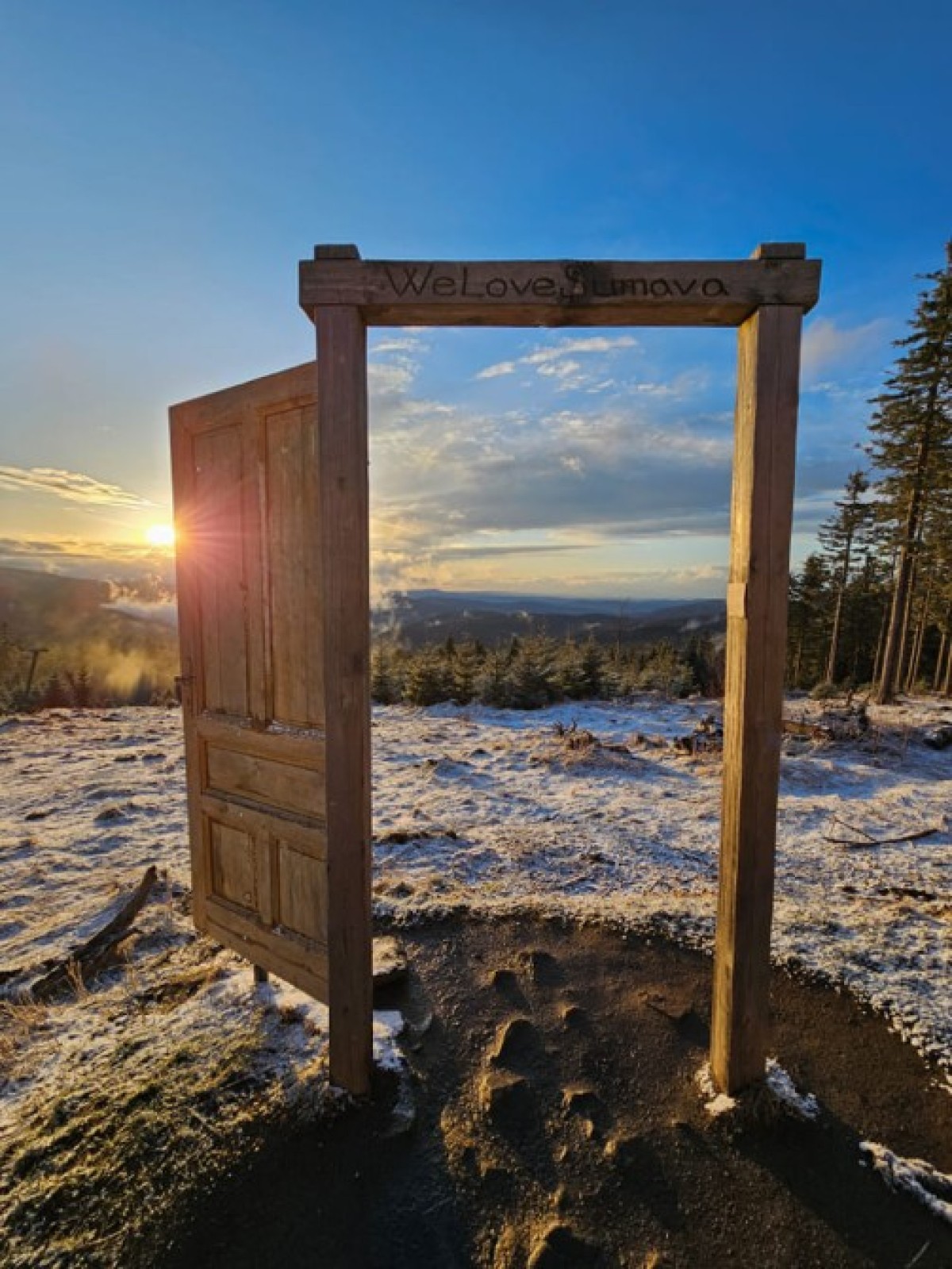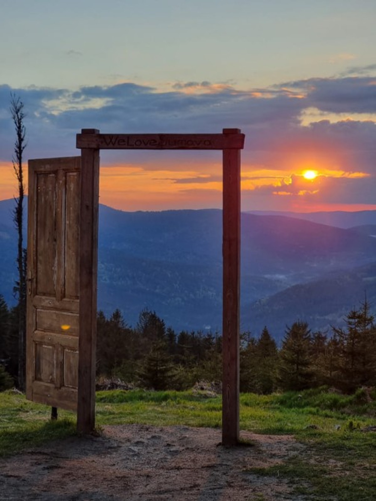 Když vyšlápnete na vrchol Pancíř (1214 m) – a vyšlápnete znamená buď po některé z turistických tras, po asfaltové silnici s kočárkem nebo i sedačkovou lanovkou – najdete zde rozhlednu, chatu a… otevřené dveře.Dveře sem umístil v roce 2019 spolek We Love Šumava, aby tak vytvořil symbolický vrchol a zároveň fotopoint s nádhernými výhledy do okolí.Dveře jsou na místě od 1. května do 31. prosince.celý popis aktivityskrýt popis