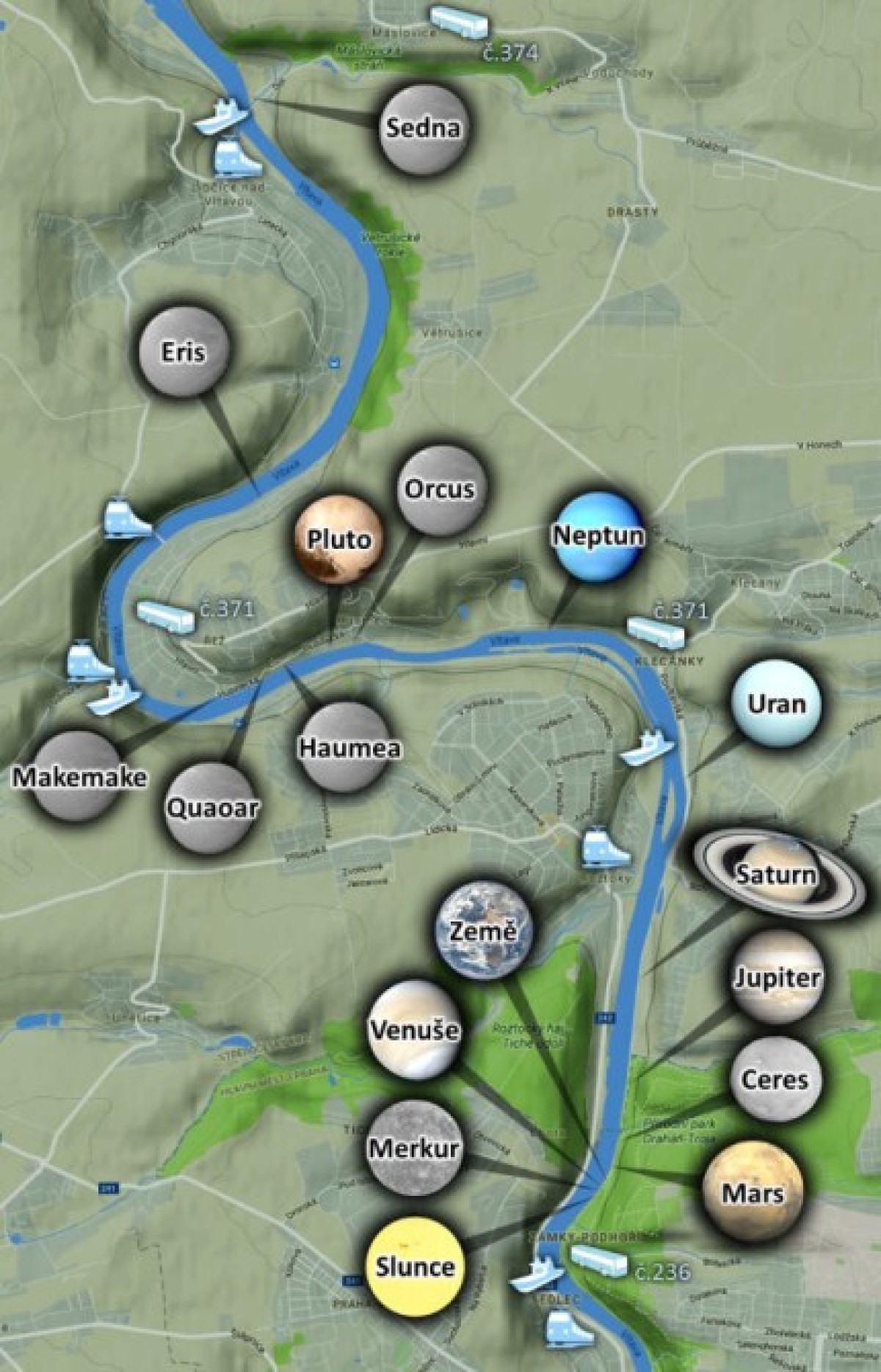 Planetární stezkaje model Sluneční soustavy v měřítku 1:1 000 000 000, zahrnující34 různých kosmických tělesv17 zastaveních naučné stezky, rozmístěných podél toku Vltavy odTróje až do Máslovic.Najdete tuSlunce, planety, velké měsíce a dokonce i trpasličí planety. Stezka je vybavenatabulkami se stručným popisemkaždého objektu, takže poskytne zajímavý cíl pro pěší či cyklistický výlet.