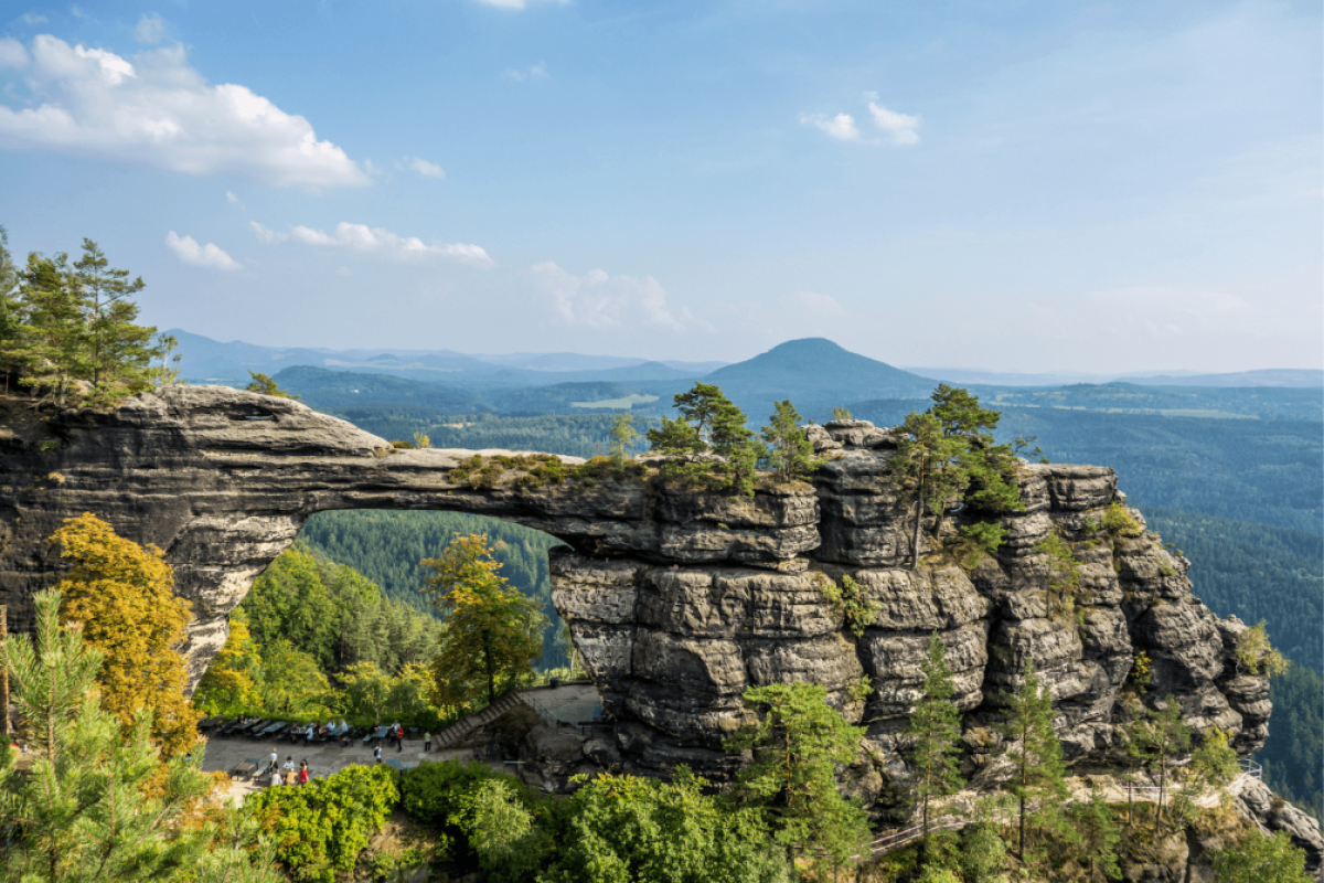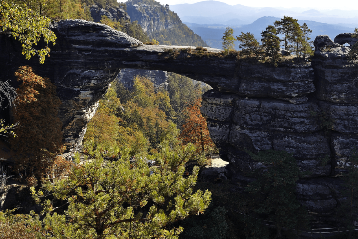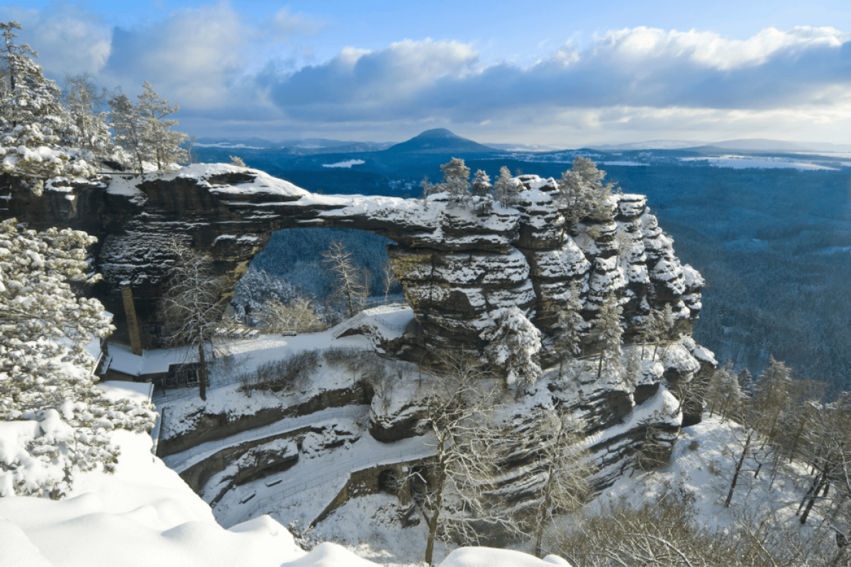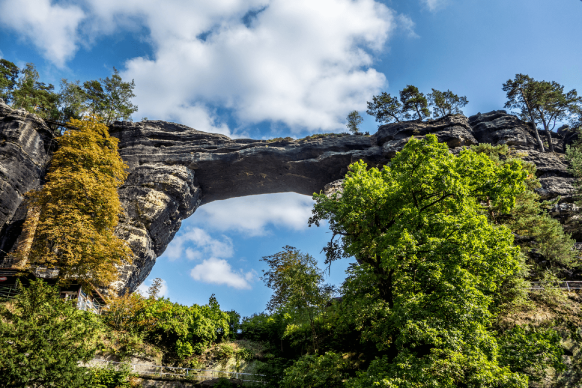 Pravčická bránaje považována zanejkrásnější přírodní útvar Českého Švýcarskaa tvoří symbol celé oblasti.Je tvořena jedním obloukem a její rozměry jsou úctyhodné: rozpětí oblouku u dna je 26,5 m, výška otvoru 16 m, šířka 7 – 8 m, minimální tloušťka 3 m, vrcholová plošina brány je 21 m nad jejím dnem.