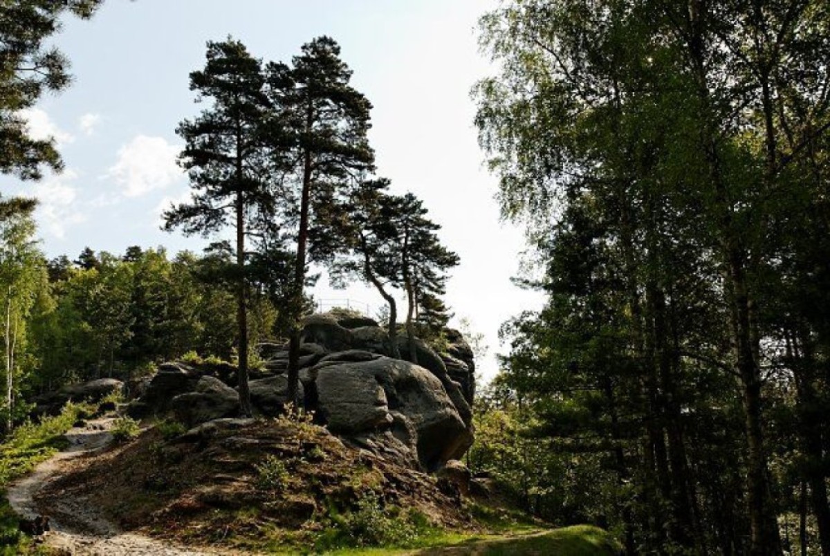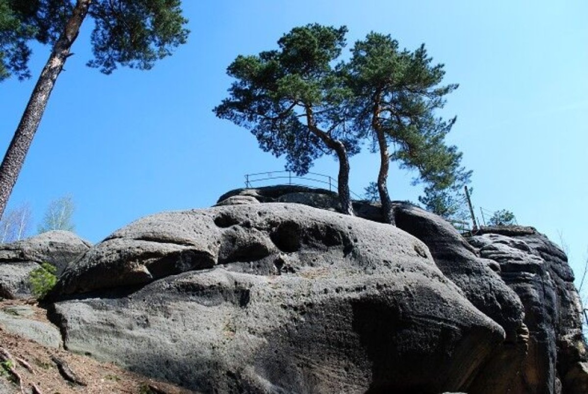 K jižní straněKunratického vrchupřiléhá pískovcový hřbet, na jehož jižním svahu jsou upravené skalnívyhlídky Ponorka a Žába. Větší Ponorku(387 m) tvoří trojice pískovcových skalních věží přístupných po vytesaných schodech a vzájemně propojených můstky se zábradlím.Z nejvyšší skályse stožárem a lavičkou jehezký výhledna Jehlu a Zámecký vrch.Asi 100 m západně odtud jemenší pískovcová skála Žábas vyhlídkovou plošinkou. Výhled z ní je ale méně rozsáhlý.